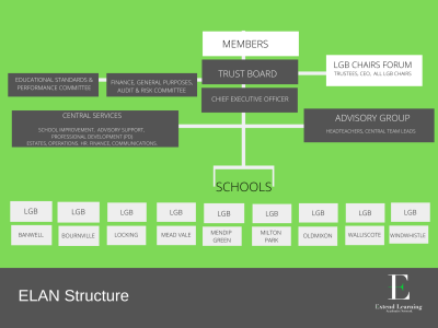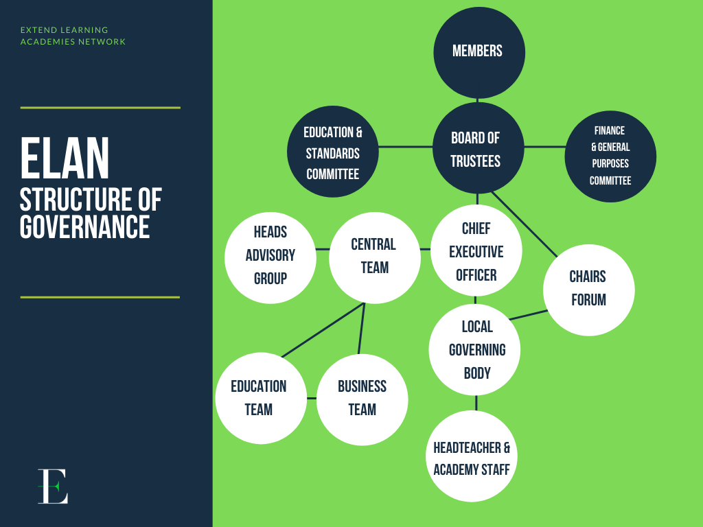 The ELAN board of trustees holds overall responsibility and final decision-making authority for all trust activities. Trustees oversee educational standards, performance, and finances across all academies within the trust, ensuring compliance with government guidelines on safeguarding, equality, and diversity. The board also determines which responsibilities to delegate to local governing bodies through the scheme of delegation.